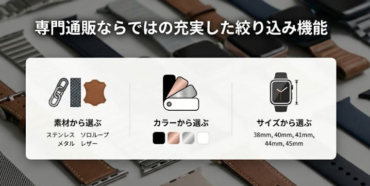 「素材・カラー・サイズ」を掛け合わせて探せるのは、アップルウォッチバンド専門店ならではの強みです。