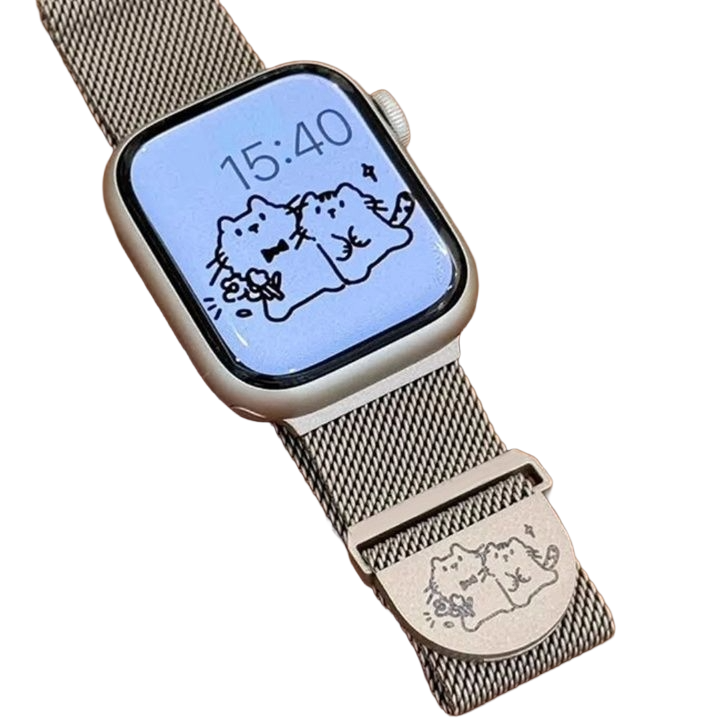 高級感あふれるメッシュ編みのアップルウォッチバンドです。チタン素材を使用した軽量でありながら耐久性に優れた設計となっています。 可愛らしい猫のイラストが施されたバックルがアクセントとなり、日常使いからカジュアルな場まで幅広く活躍します。 アップルウォッチバンドの着脱も簡単で、チタン特有の肌触りの良さも魅力です。