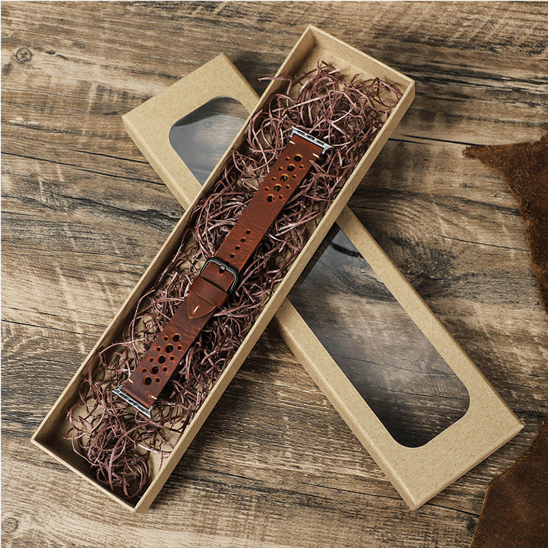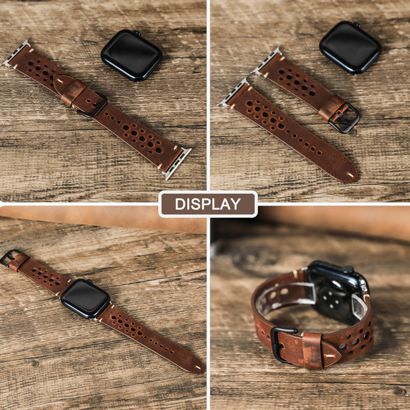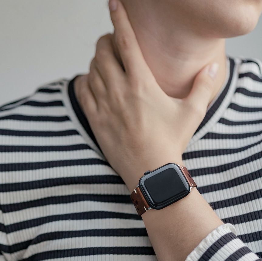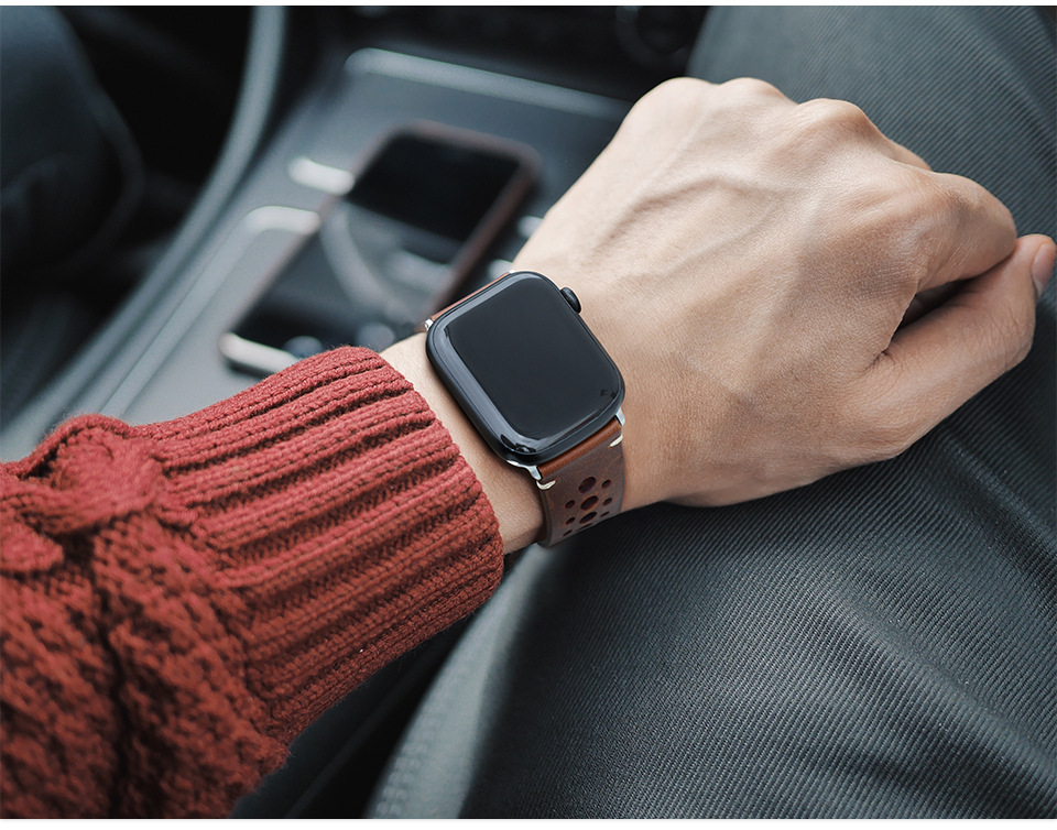 上質な本革に施された規則的なパンチング加工が特徴のアップルウォッチバンドです。 通気性に優れたレザー素材で、長時間の着用でも快適にお使いいただけます。 シンプルな一重巻きデザインは、ビジネスシーンからカジュアルまで幅広く対応します。 経年変化を楽しめる本革の質感が、手元に上品な印象を添えます。 金属製の留め具でしっかりと固定でき、日常使いに最適な一本です。