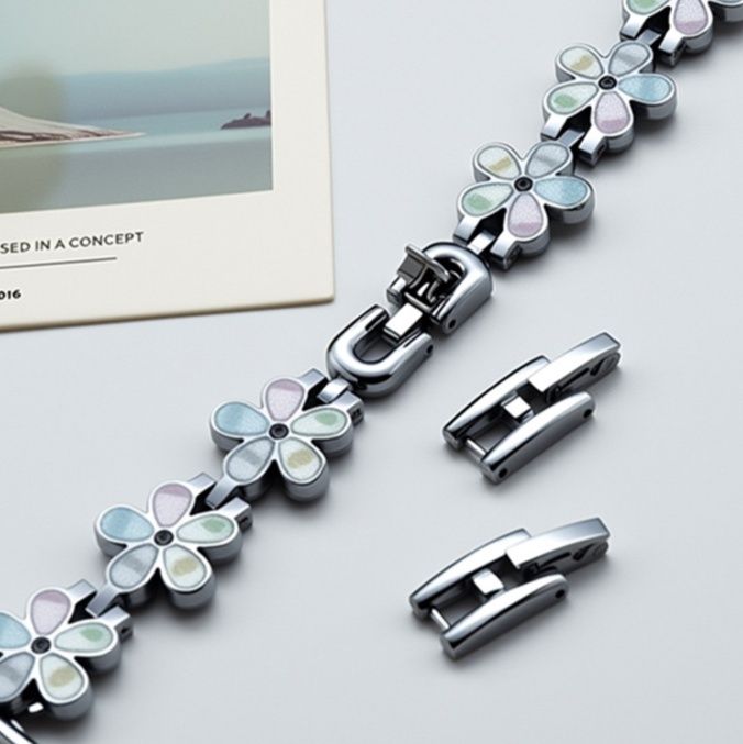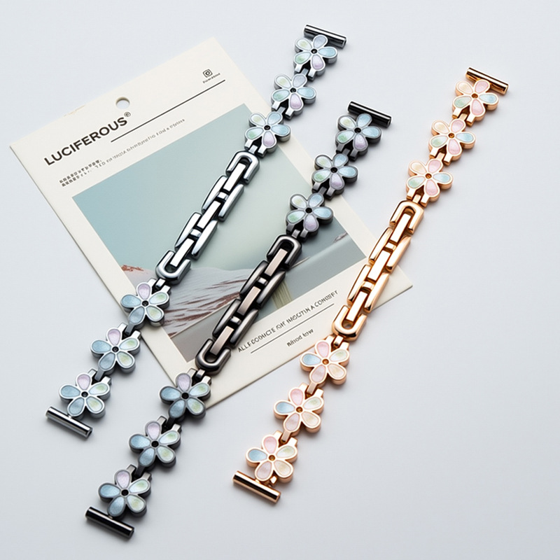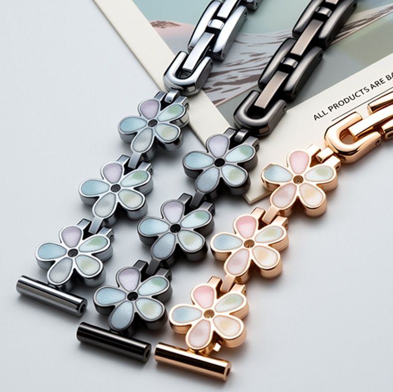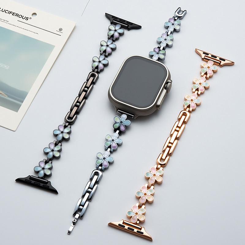 可憐な花のモチーフが連なる華やかなデザインのアップルウォッチバンドです。 ステンレス製のチェーンと花の装飾が絶妙に組み合わさり、エレガントな手元を演出します。 中央のチェーン部分が上品なアクセントとなり、日常使いから特別な日まで幅広く活躍します。 軽量で快適な着け心地ながら、しっかりとした耐久性も兼ね備えています。 女性らしさを引き立てる洗練されたデザインが魅力の一品です。
