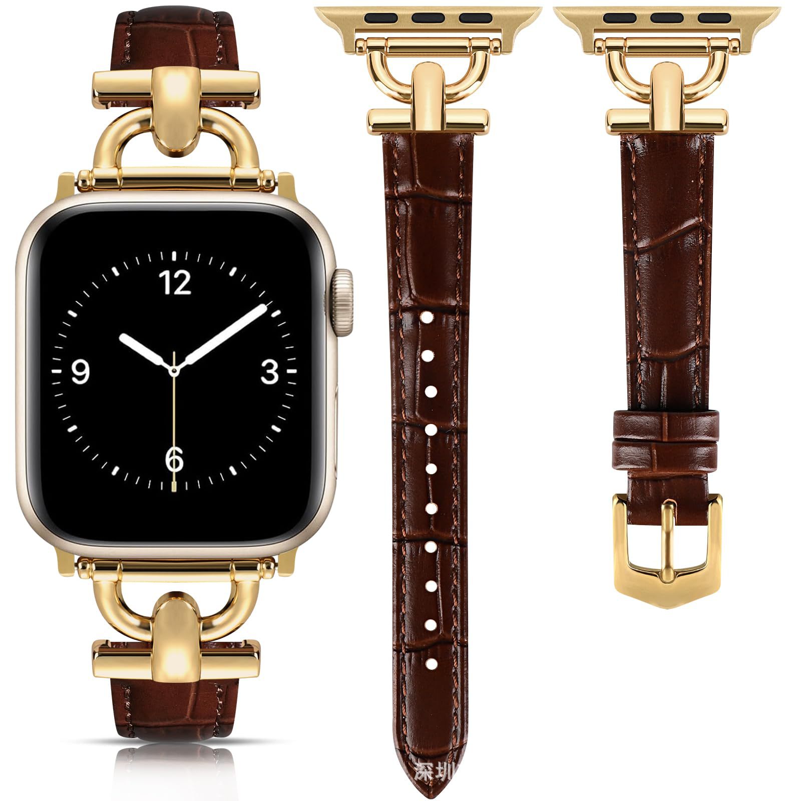 高級感あふれる型押しレザーを使用したアップルウォッチバンドです。 美しい光沢を放つ金具とチェーン風の装飾パーツが手元を華やかに演出します。 クロコダイル調の型押しが施されたレザー素材は上品で洗練された印象を与え、ビジネスシーンからフォーマルな場面まで幅広く活躍します。 細身のデザインで女性らしさを引き立て、日常使いにも特別な日にもおすすめの一品です。