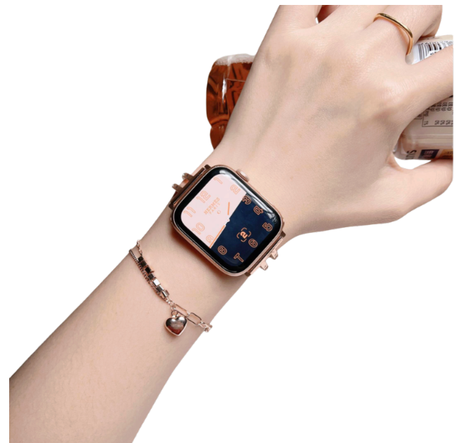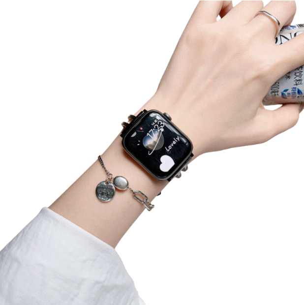 ハートチャーム付きアップルウォッチバンド、洗練されたメタル素材で日常からフォーマルシーンまで幅広く対応。 チタン素材を一部採用し軽量かつ耐久性に優れた設計。 着け心地の良さと上品なデザインを両立したストラップです。