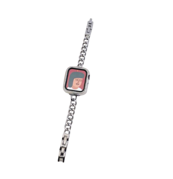 高級感溢れるチェーンデザインのアップルウォッチバンド。 メタル素材とチタン加工で腕元に洗練された印象を与えます。 クリスタルが施されたケースと組み合わせることで、時計がジュエリーのように変身。 日常使いからパーティーまで幅広く活躍する上質なアイテムです。