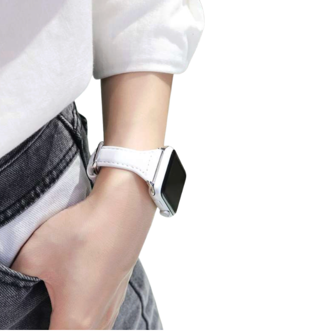 洗練された白いレザー素材で仕立てたアップルウォッチバンド。クラシックなバックル式により、簡単に着脱可能。様々なスタイルやシーンにマッチし、スマートウォッチをファッションの一部として楽しめる。耐久性と快適さを兼ね備えたこの上質なバンドは、日常使いにも特別な場面にもぴったりです。どんなコーディネートにも華やかさをプラスします。