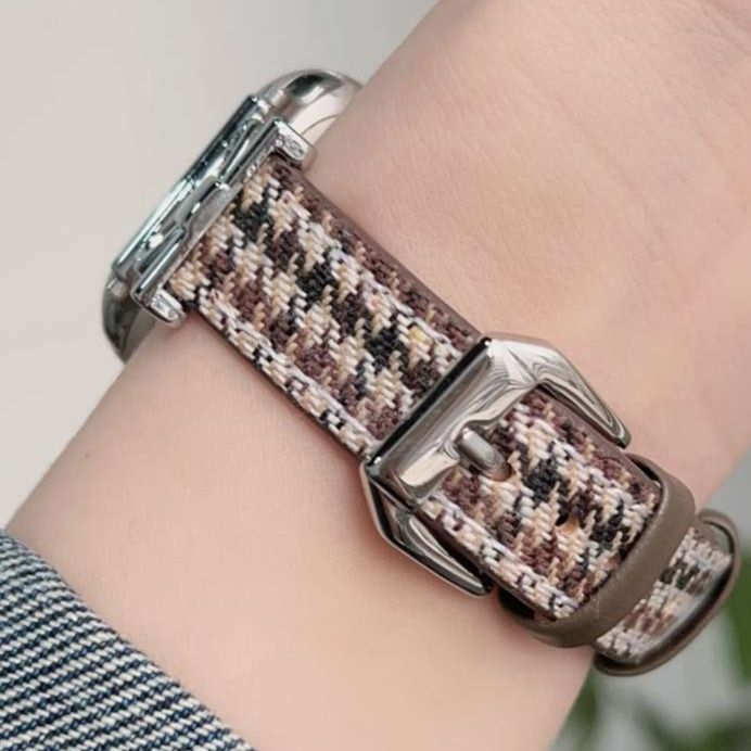 千鳥格子柄のファブリックバンドは、アップルウォッチに高級感と個性をプラスします。耐久性に優れた素材を使用し、金属製の留め具がスタイリッシュなアクセントに。簡単な着脱が可能で、腕時計本体との相性も抜群。日常使いからビジネスシーンまで、幅広く活躍すること間違いなしのアイテムです。あなたのアップルウォッチを一層引き立てるこのバンドで、個性を表現しましょう。