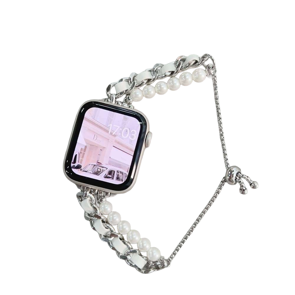 エレガントなデザインのステンレス製アップルウォッチバンド。真珠とメタルチェーンを巧みに組み合わせ、高級感と女性らしさを引き立てるスタイルが特徴。調節可能なチェーンストラップにより、腕時計としてだけでなくブレスレットとしても楽しめる二way仕様。洗練された印象を与え、日常使いにも特別なシーンにもぴったりのアイテム。