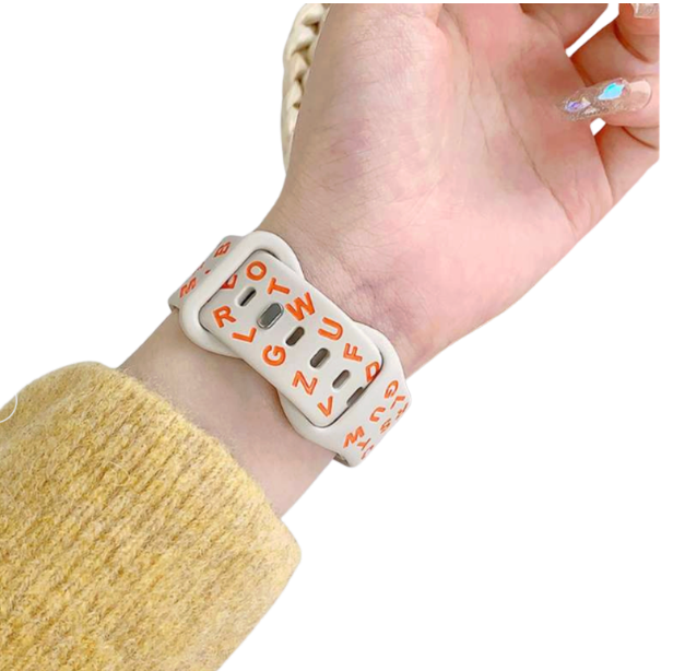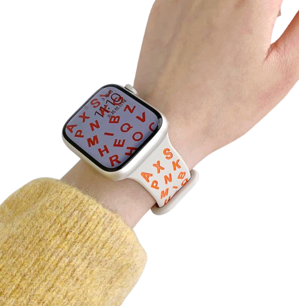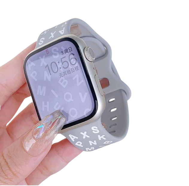 アップルウォッチバンド対応のシリコン製スポーツバンド。 ランダムなアルファベットをデザインしたスタイリッシュな外観で腕元のアクセントに。 軽量で快適な装着感のゴム素材で、耐水性もあるラバー製。 日常使いからスポーツまで幅広く対応する実用的なバンドです。