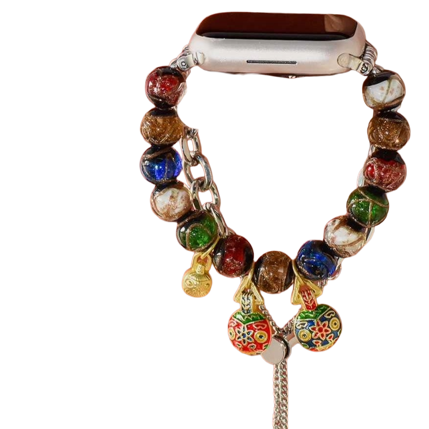 色とりどりの玉飾りと伝統的な文様が魅力のアップルウォッチバンド。金属チェーンとの調和が生み出すモダンな雰囲気は、日常のスタイルに和のエッセンスをプラスします。装いのアクセントとして、特別な一品としておすすめのベルトです。あなたのアップルウォッチに個性を与えるこのバンドで、装飾性と機能性を両立させましょう。